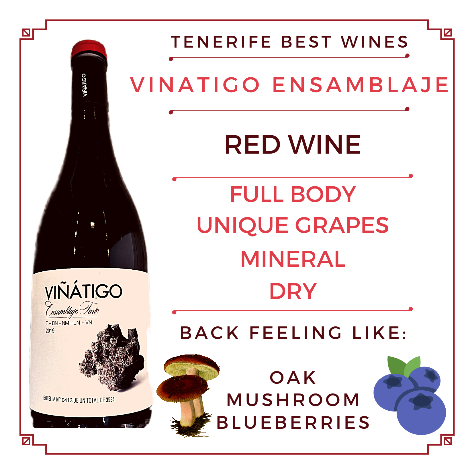 Viñátigo Ensamblaje tinto es un vino de Bodegas Viñátigo, bodega que se encuentra a las afueras de La Guancha, al noroeste de Tenerife, donde reúne ocho parcelas de viñedo en distintas alturas y suelos volcánicos. La filosofía de trabajo se orienta hacia una agricultura sostenible y una elaboración que busca la expresión de las variedades autóctonas de la isla mediante una intervención muy respetuosa en la bodega.