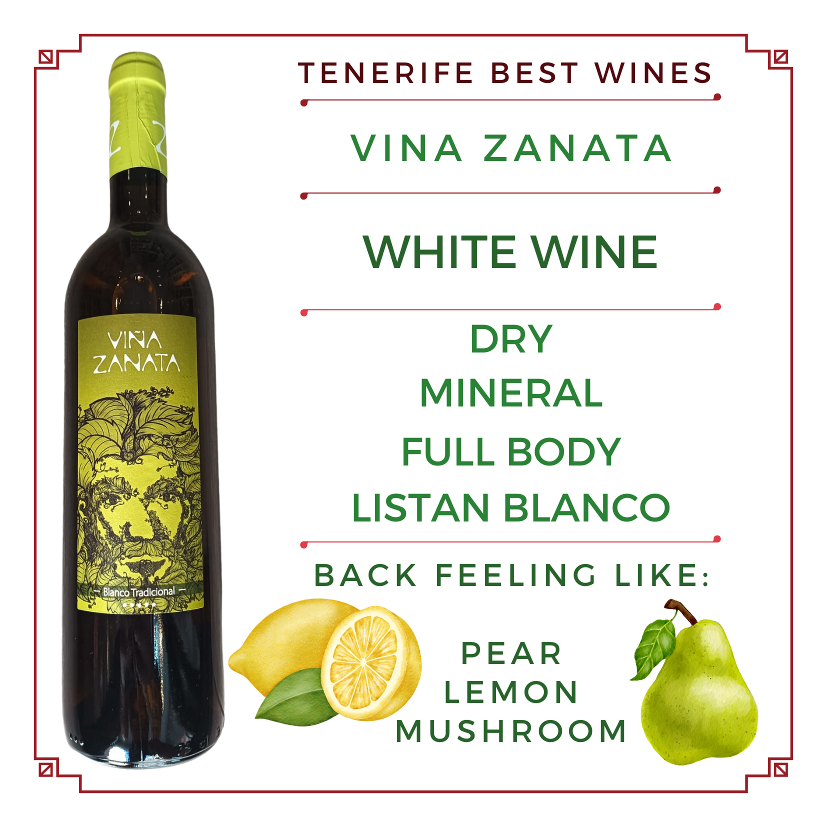 El vino blanco Seco de Viña Zanata está elaborado al 100% con un tipo de uva denominada Listán Blanco que es originaria de las islas, de origen natural sin pesticidas ni herbicidas, su color característico es el amarillo pajizo acompañado de un conjunto de aromas que incluyen florales y frutales.